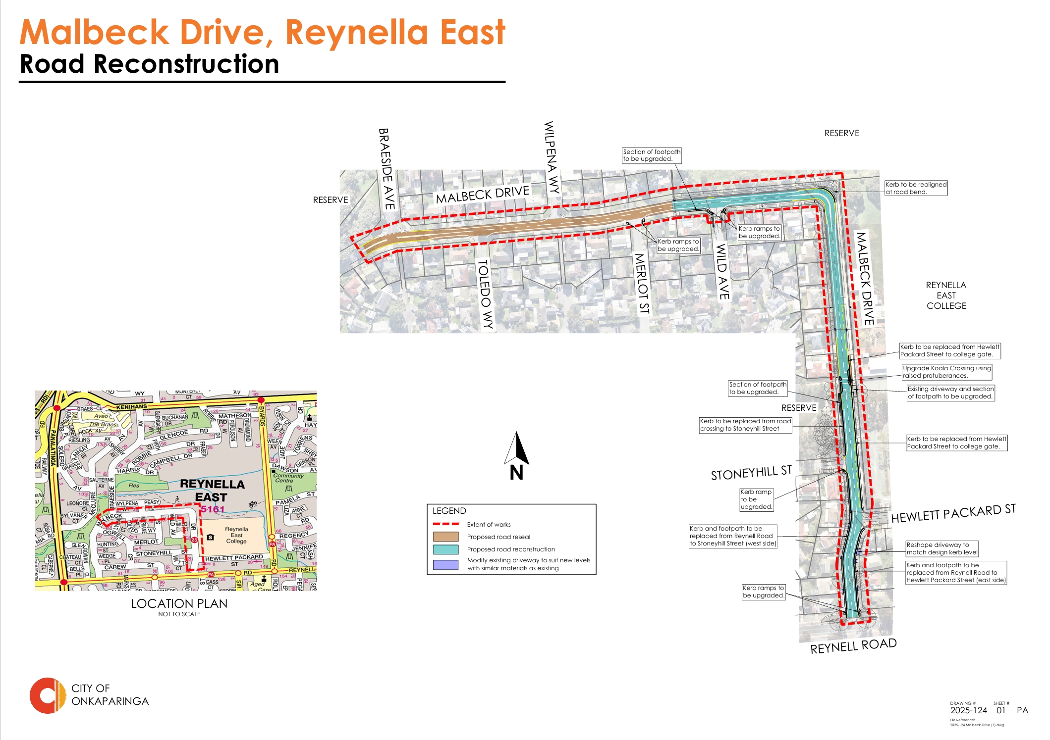We are planning to reconstruct Malbeck Drive, Reynella East between the eastern intersection with Reynell Road and Merlot Street to address significant pavement defects, improve drainage and replace identified damaged sections of kerbing. This work is required to address pavement failure, preventing further deterioration of the pavement layers and ensure the road remains fit for purpose.